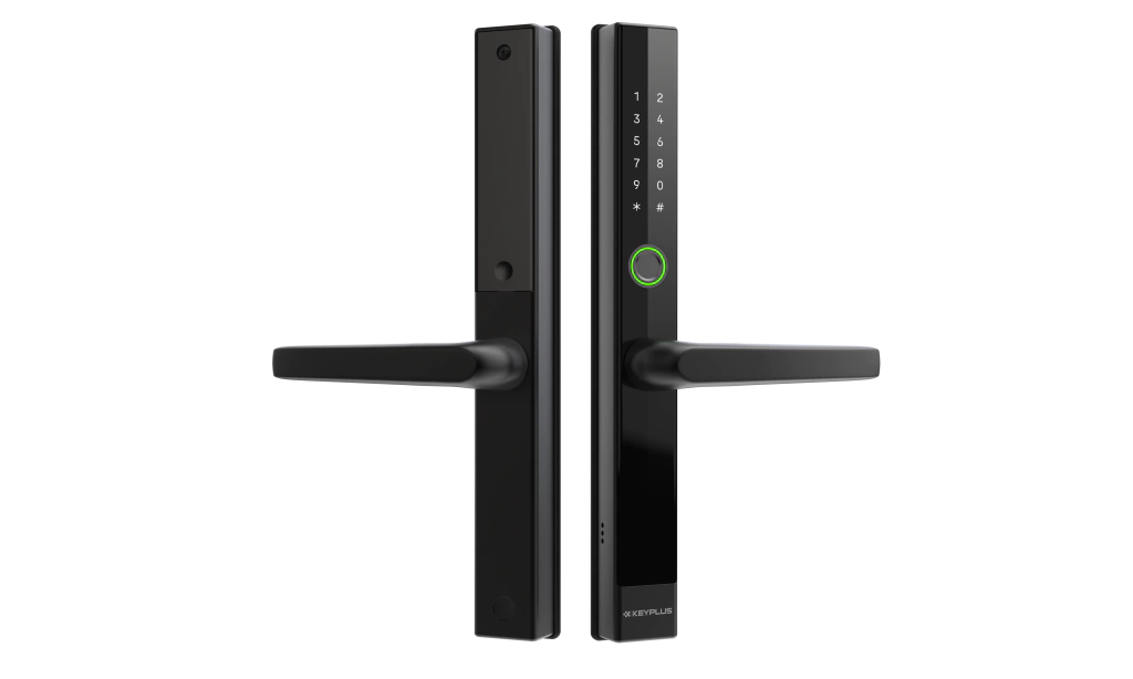 Cerradura digital inteligente T5 con apertura por huella, código, tarjeta y Bluetooth. Compatible con puertas de perfil angosto (PVC o aluminio), resistente al agua IP65. Control total desde la app: alta y baja de usuarios, acceso a registros de apertura, generación de usuarios temporales y verificación de batería.